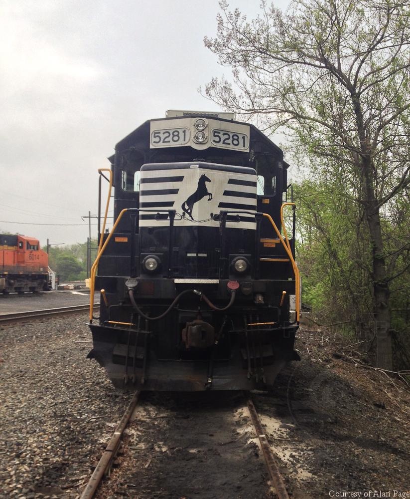 With BNSF ES44AC 6014 in the background, NS 5281 (CR 8078) GP38-2 rests at Morrisville on May 10, 2014.