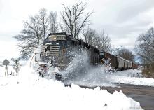 NS K22 local out of Northumberland Yard with pull-pull power configuration with ex-PC/CR 8149 GP38-2 leading and 19 cars plows through plowed Gardner Road crossing heading east on the Watsontown Secondary.