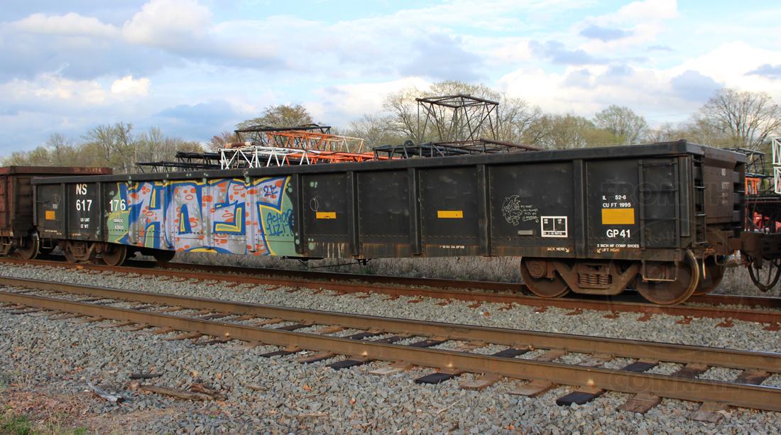 NS 617176 is seen at Westville, NJ on 4/20/15. Car is ex CR 576080/PC 576080 and was built 2-68. Car was repainted NS 12-06 by RA DFWB and is classed GP41 by NS.