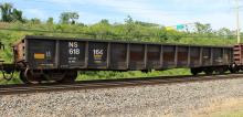 NS 618164 is seen in the consist of EB NS 61Z at Wyomissing, PA on 8/16/14. Car is ex CR 578266/PRR 387411 and was built 9-66.