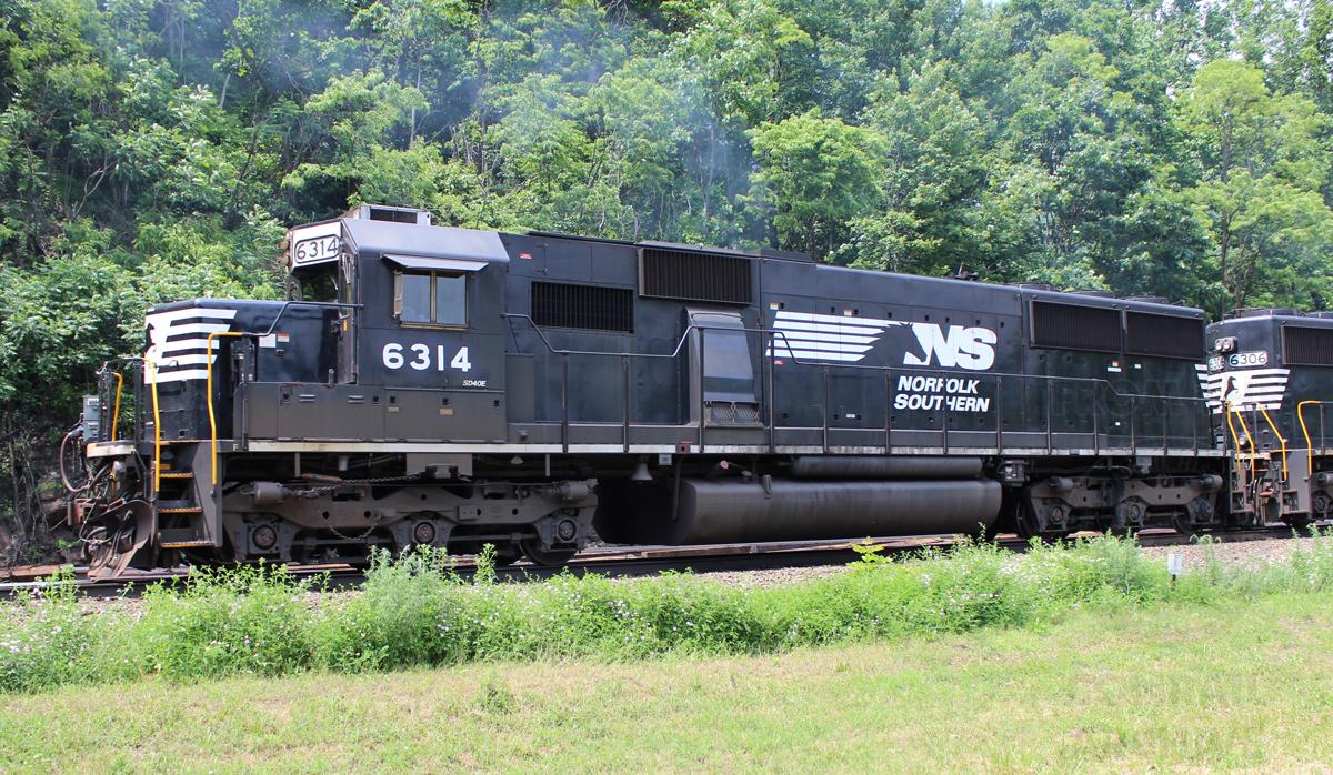 Former NS 5431/CR 6754 is seen on the rear on NS 410 at Horseshoe Curve in Altoona PA on 6/13/14. Unit was rebuilt by NS to a SD40E and was released from JBS in June of 2009.