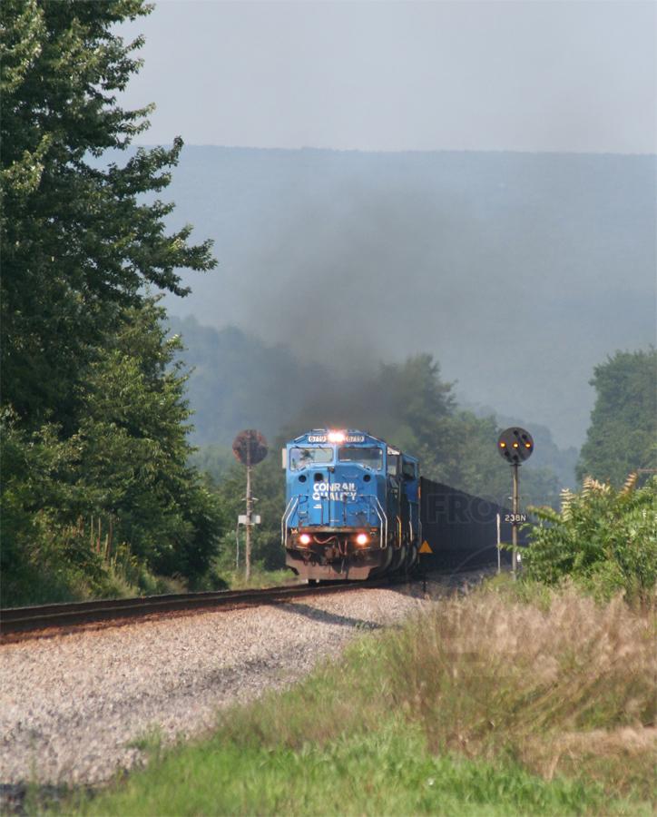 NS 6719 ( Ex CR 5580), NS 6721 (Ex CR 5582), and NS 6718 (Ex CR 5578) lead load PPLX coal train 410 on the Watsontown Secondary on August 15th 2009.