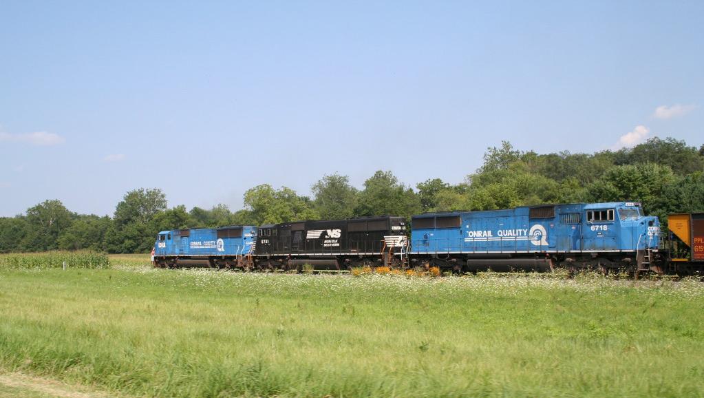 NS 6719 ( Ex CR 5580), NS 6721 (Ex CR 5582), and NS 6718 (Ex CR 5578) lead load PPLX coal train 410 towards the Watsontown Secondary on August 15th 2009.