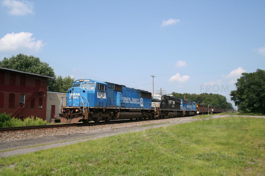 NS 6719 ( Ex CR 5580), NS 6721 (Ex CR 5582), and NS 6718 (Ex CR 5578) lead load PPLX coal train 410 towards the Watsontown Secondary on August 15th 2009.