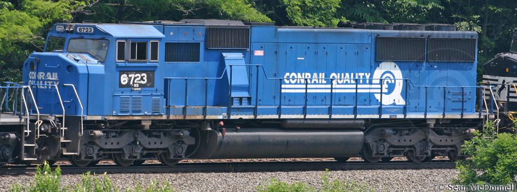 Former Conrail SD60I 5586 is braking hard as she drifts downgrade on Horseshoe Curve on 7/7/2007