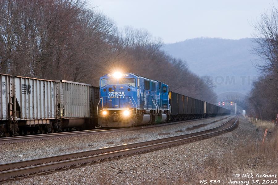 A pair of ex-Conrail SD60Is lead Pennsylvania Power and Light empties back to the mine fields of western PA. They are heading west on Track 1 around another empty hopper train, NS 501, on Track 2. Click here to see a photo of NS 501.