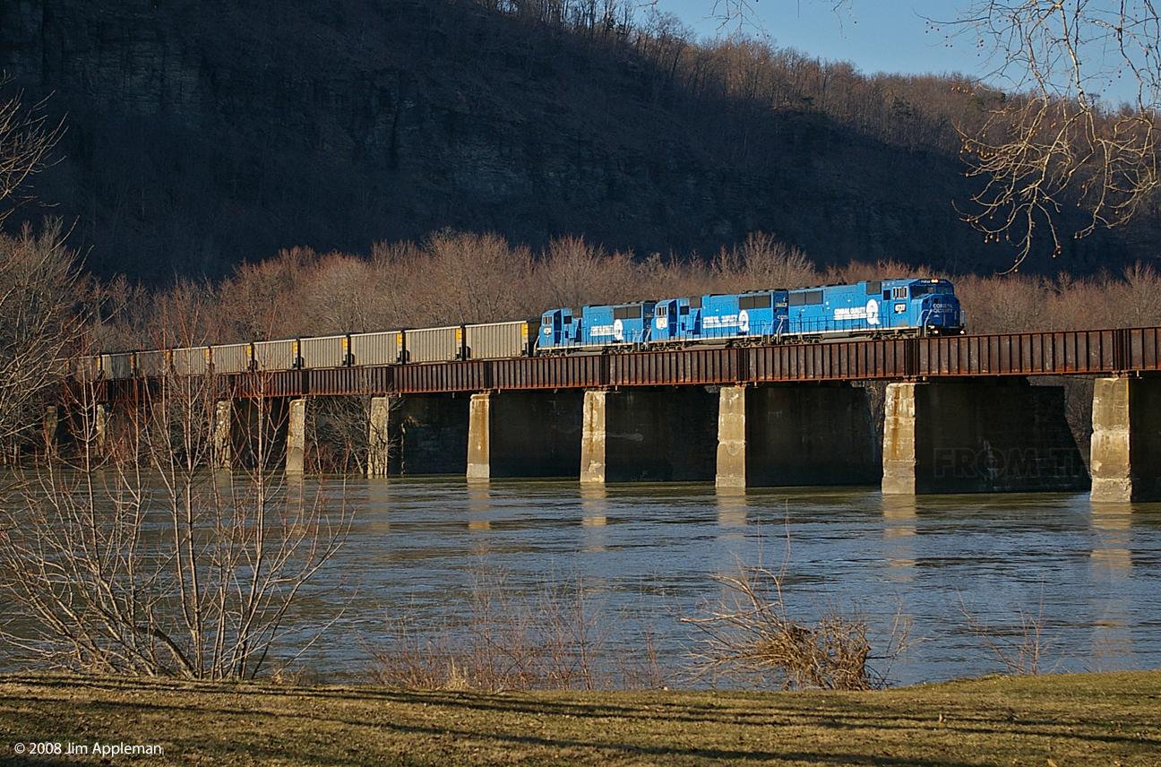 NS 536 PPLX "Ridge" train with 3 assigned SD60Is crosses the West Branch of the Susquehanna River heading south on the Buffalo Line in late afternoon towards CP-WAT and the Watsontown Secondary to Montour Power Plant.
