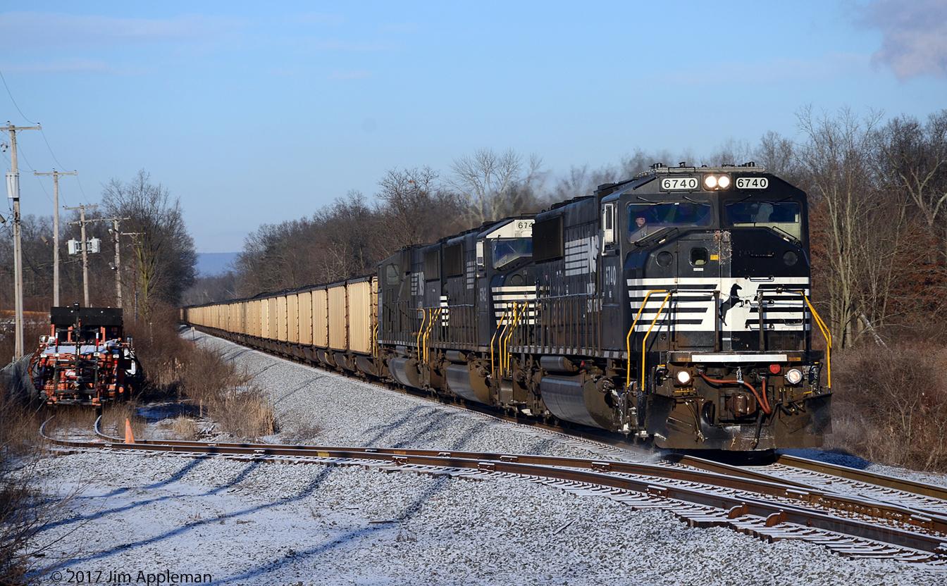 A very slick coating of graupel on the rails caused this NS 538 coal train with NS 6740, 6742, & 6720 SD60Is for Montour Power Plant to stall at M.P. 5.5 on Turbotville hill on the NS Watsontown Secondary. NS 3339 (CR 6369) is giving a push on the rear the rest of the trip to the plant.
