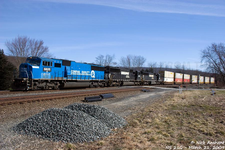 This trio of SD60s lead NS 21G westbound across James Drive, just east of Newport, PA. The leader is ex-Conrail SD60M 5572.