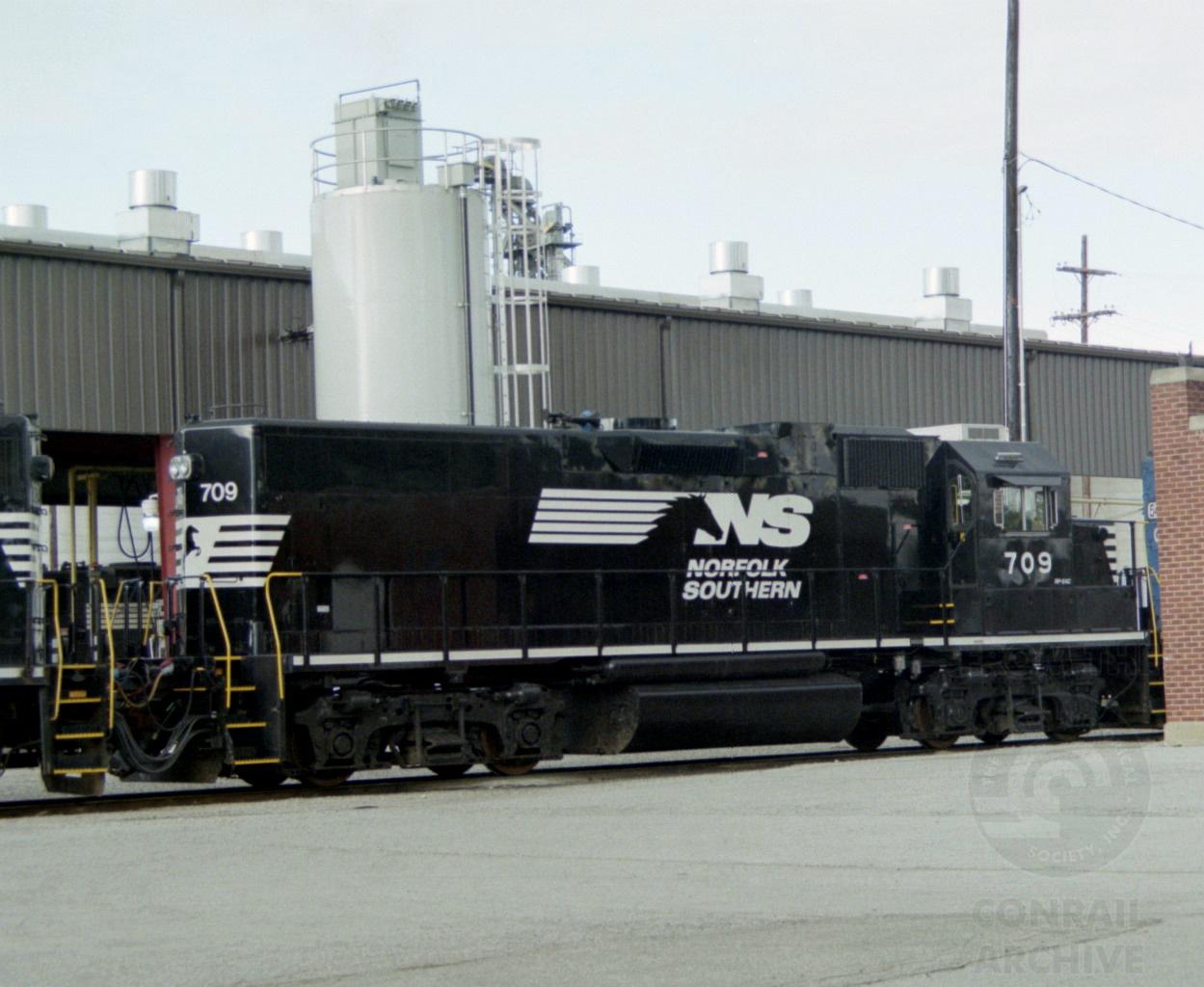 NS 709(ex CR 7880), a rebuilt GP38 road slug sits at the diesel pit in East Wayne yard New Haven, IN on May 8, 2010. Units official history is ex NS 2928, ex CR 7880, nee PC 7880.