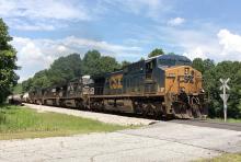 CSX 570 leads NS 8323 (CR 6065) and 9588 and CSX 3238 and 3126 SB with mixed freight through Fairburn, GA on July 18, 2018.
