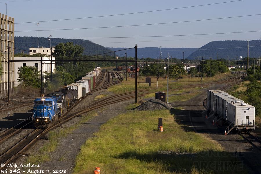 NS 14G has just departed the fuel pad with full tanks and a fresh crew. The Harrisburg intermodal yard can be seen in the background with lead tracks off to the right.