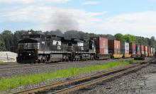Former CR 6259 is seen leading NS 20R east at Cresson PA on 6/28/13. Note unit has high mounted number boards as a result of wreck repairs by Conrail. The other CR C40-8W that received high mounted number boards, CR 6192, is now CSXT 7357.