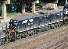NS 864 is seen in a set of hump power at Baden (East Conway), PA on 6/16/22.Slug is ex NS 973/NS 1103/CR 1105/CR 6878/PC 6878/PRR 6878/PRR 8678.