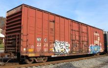 NYC 223427 is seen on Q375-14 at Cumberland, MD on 11/14/2012. Car was built 10-78 by Berwick.