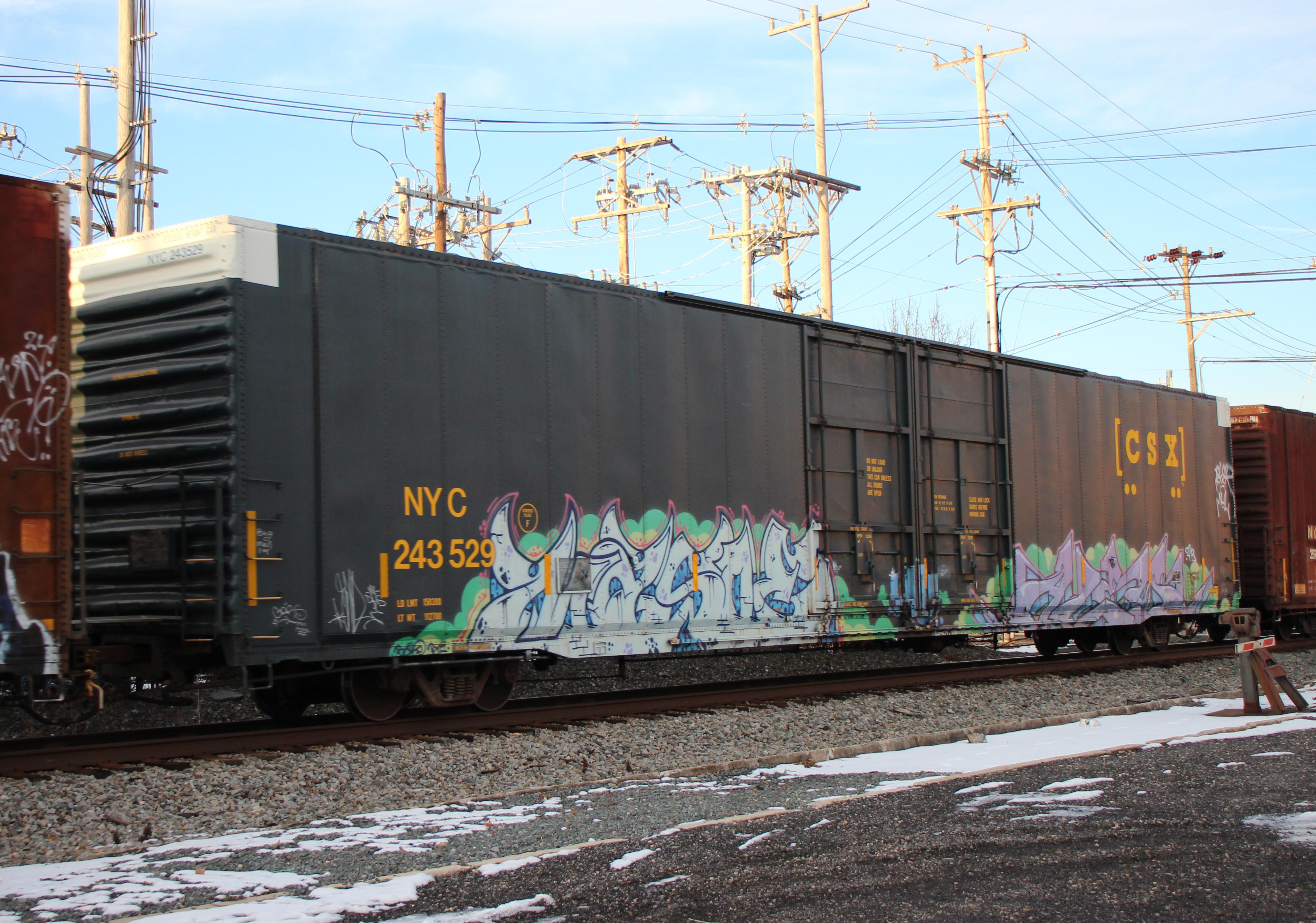 NYC 243529 is seen in the consist of CSX L120-26 at Newark, DE on 1/26/25.Car is ex CR 243529/CR 297731 and was built 4-78 by Greenville Steel Car.