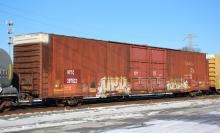 NYC 297622 is seen in the consist of CSX Q372-29 at Elsmere, DE on 1/30/22.Car is ex CR 297622 and was built 4-78 by Greenville Steel Car. It was painted CR-BR 3-84 and incorrectly stenciled as a BE83A.