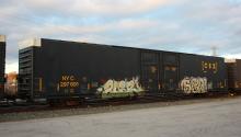NYC 297691 is seen in the consist of CSX D775-26at Elsmere, DE on 11/26/21. Car is ex CR 297691 and was built 4-78 by Greenville Steel Car.