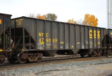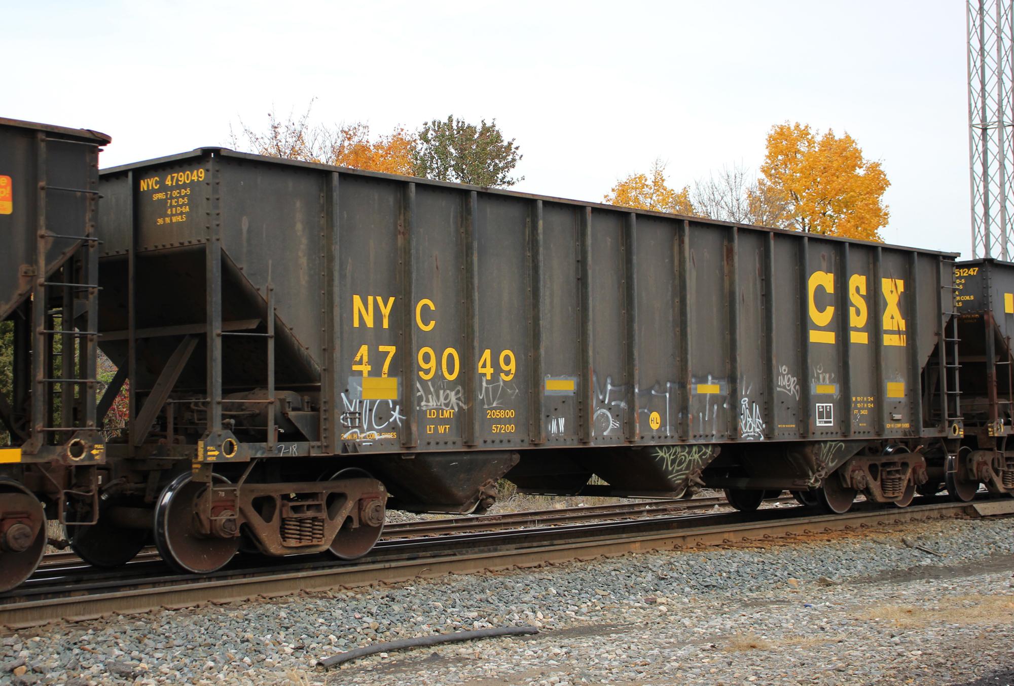 NYC 479049 is seen in the consist of CSX Q372-13 at Elsmere, DE on 11/14/21. Car is ex CR 479049/RDG 483521 and was built 12-75. It was rebodied and painted CSX RA 10-00.
