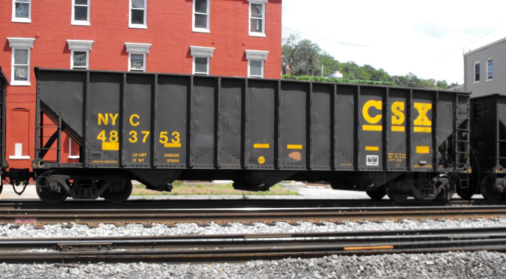 NYC 483753 is seen on V630-08 at Cumberland MD on 8/9/12. Car is ex CR 483753/RDG unknown, blt 12-75 and was repainted CSX 11-00.