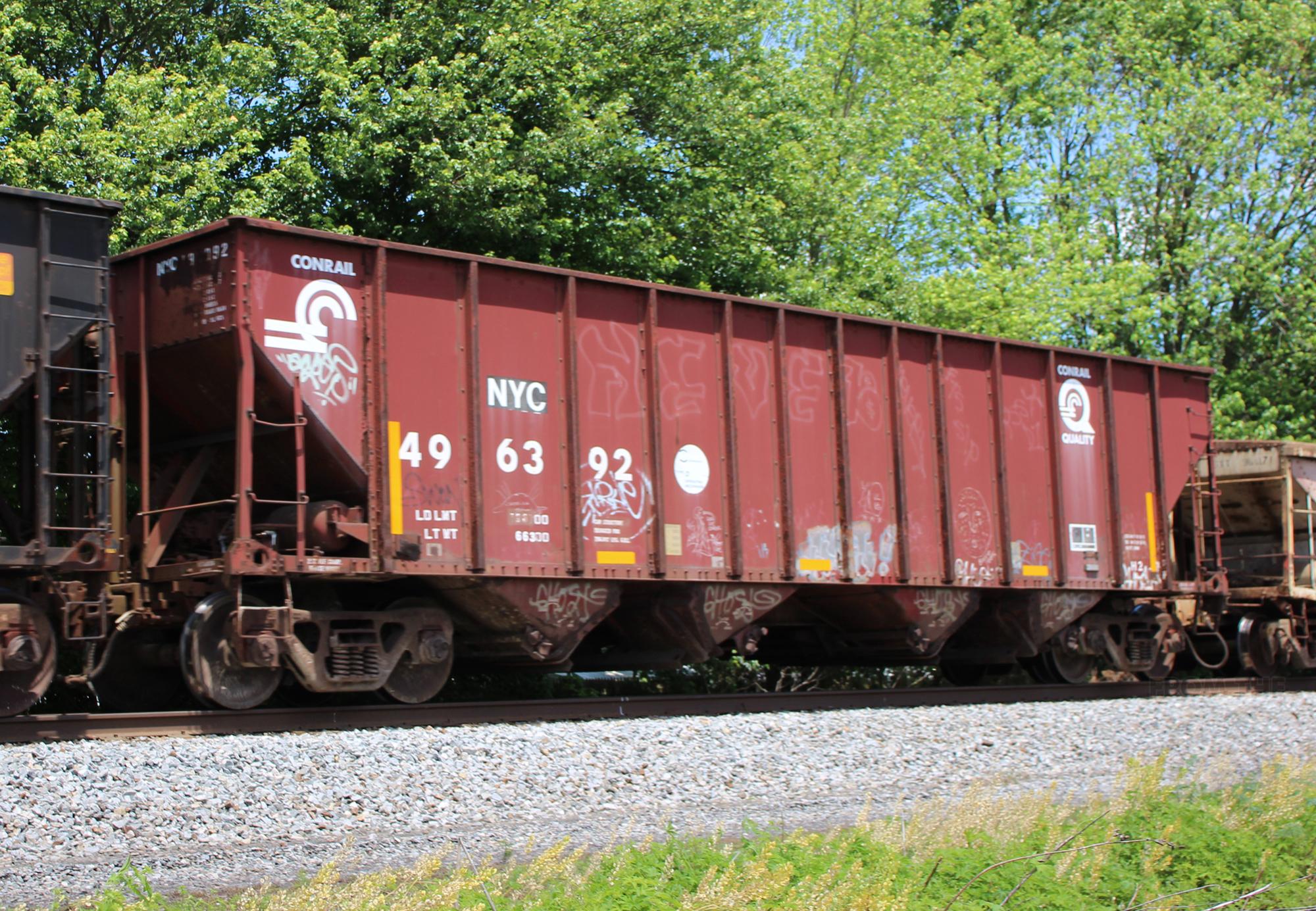 NYC 496392 is seen in the consist of CSX Q372-30 at Newark, DE. Car is ex CR 496392 and was built 8-94 (painted 8-19-94) by HCS.