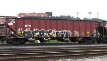 NYC 498784 is seen on V645-07 at Cumberland MD on 8/9/12. Car is ex CR 498784 and was built by HCS in 7-98.