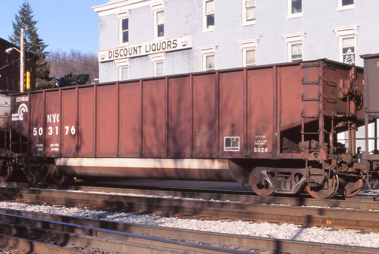 NYC 503176 is seen on westbound E805-08 at Cumberland, MD on 2/8/03. Car is ex CR 503176/CR 477075/PRR 228436 and was built 11-65, rebuilt 4-90. It was deleted on 5-9-07.