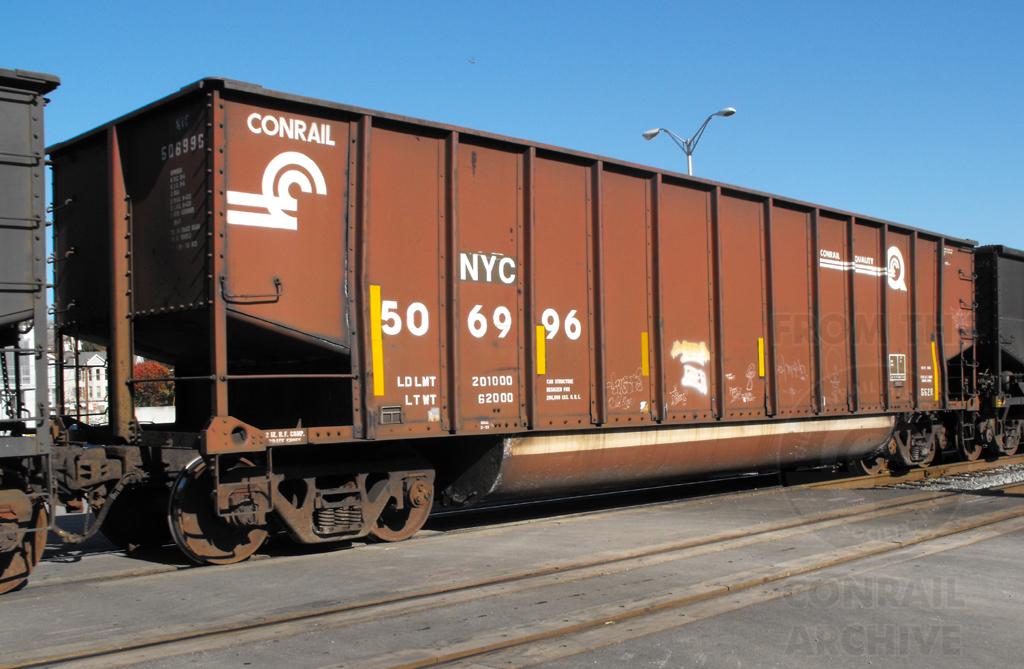 NYC 506996 is seen on T875-03 at Brunswick MD on 11/12/11. Car is ex CR 506996, which was rebuilt from PC 480444, a former PC class H43D hopper. Blt 11-71 rebuilt 3-93.