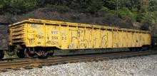 NYC 55522 is seen on W951-08 at Fairhope PA on 8/11/12. Car is ex CR 55522/PC 598??? and was built 5-72 by Fruehauf. Car was painted yellow CR-BL 3-89 and placed in MOW service.