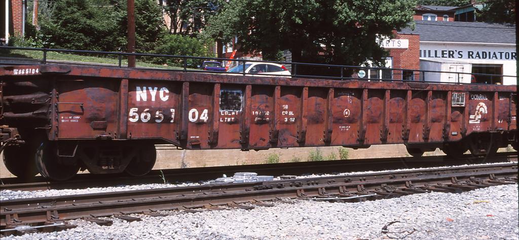 NYC 565104 is seen on CSX K501-02 at Viaduct Junction in Cumbrland MD on 6/3/02. Car is ex CR 565104/PC 565104, built 3-72 and was painted CR-BL 3-82.