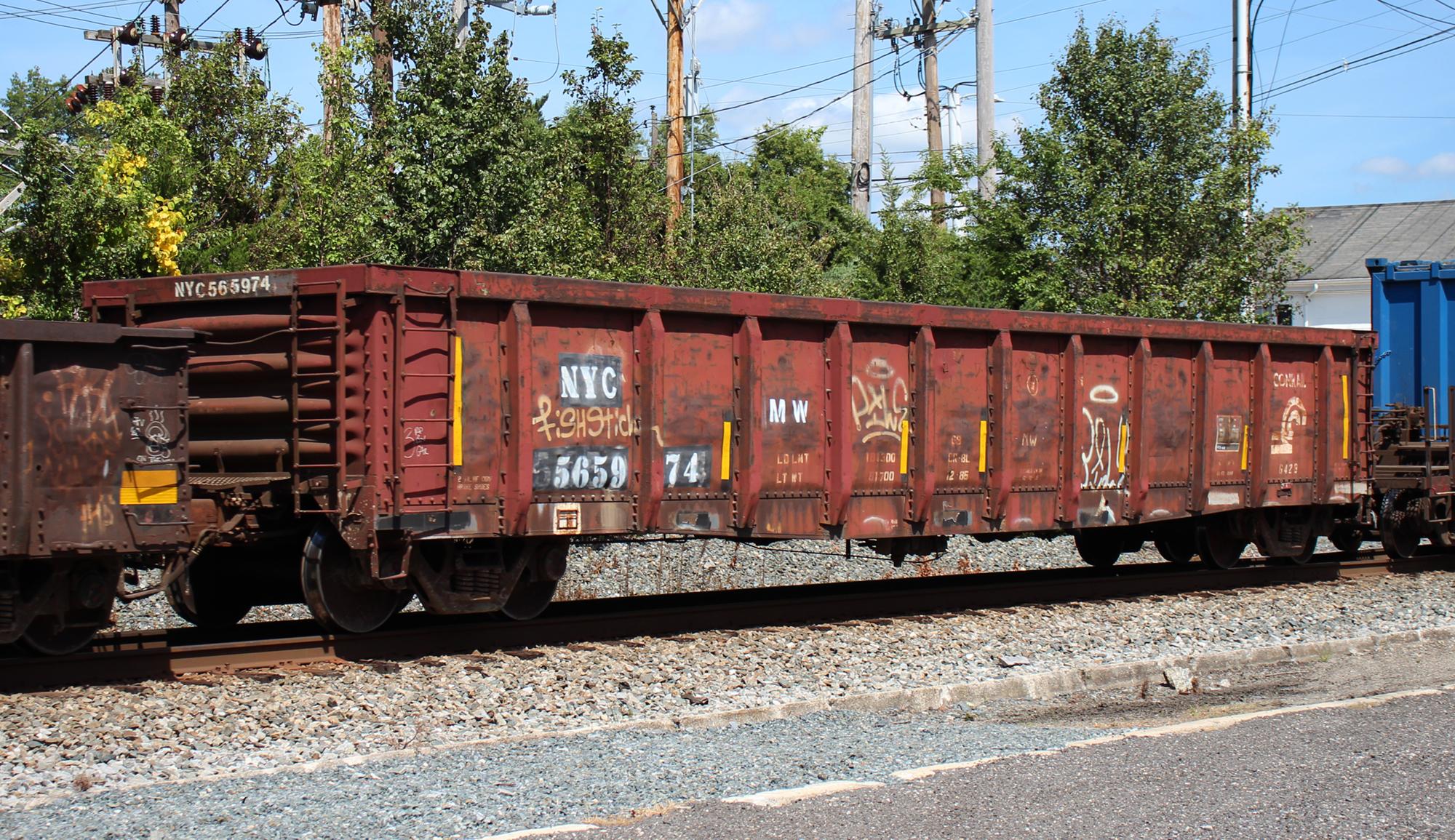 NYC 565974 is seen in the consist of CSX M421-01 at Newark, DE on 9/2/23. Car is ex CR 565974/PC 623331, built 9-69 and was painted CR-BL 12-85 (Cleaned CR SR 12-12-85).