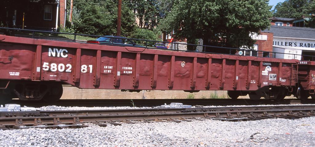NYC 580281 is seen on CSX K501-02 at Viaduct Junction in Cumberland MD on 6/3/02. Car is ex CR 580281/PC 580281 and was built 11-71.