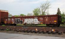 NYC 588455 is seen in the consist of CSX Q410-01 at Elsmere, DE on 5/3/20. Car is ex CR 588455/CR 577024/PRR 387683 and was built 11-66 as a PRR G43 class gon. Photo by Chris Carangi.