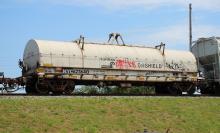 NYC 623640 is seen in the consist of CSX Q300-17 at Newark, DE on 5/18/19. Car is ex CR 623640 and was built 5-97 by Thrall as part of Job 989. Photo by Chris Carangi.
