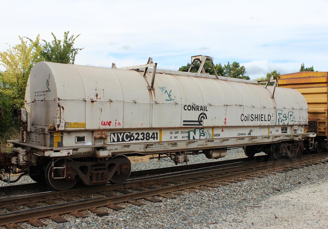 NYC 623841 is seen in the consist of CSX Q301-25 at Elsmere, DE on 9/26/15. Car is ex CR 623841 and was built 7-97 by Thrall as part of Job 413.