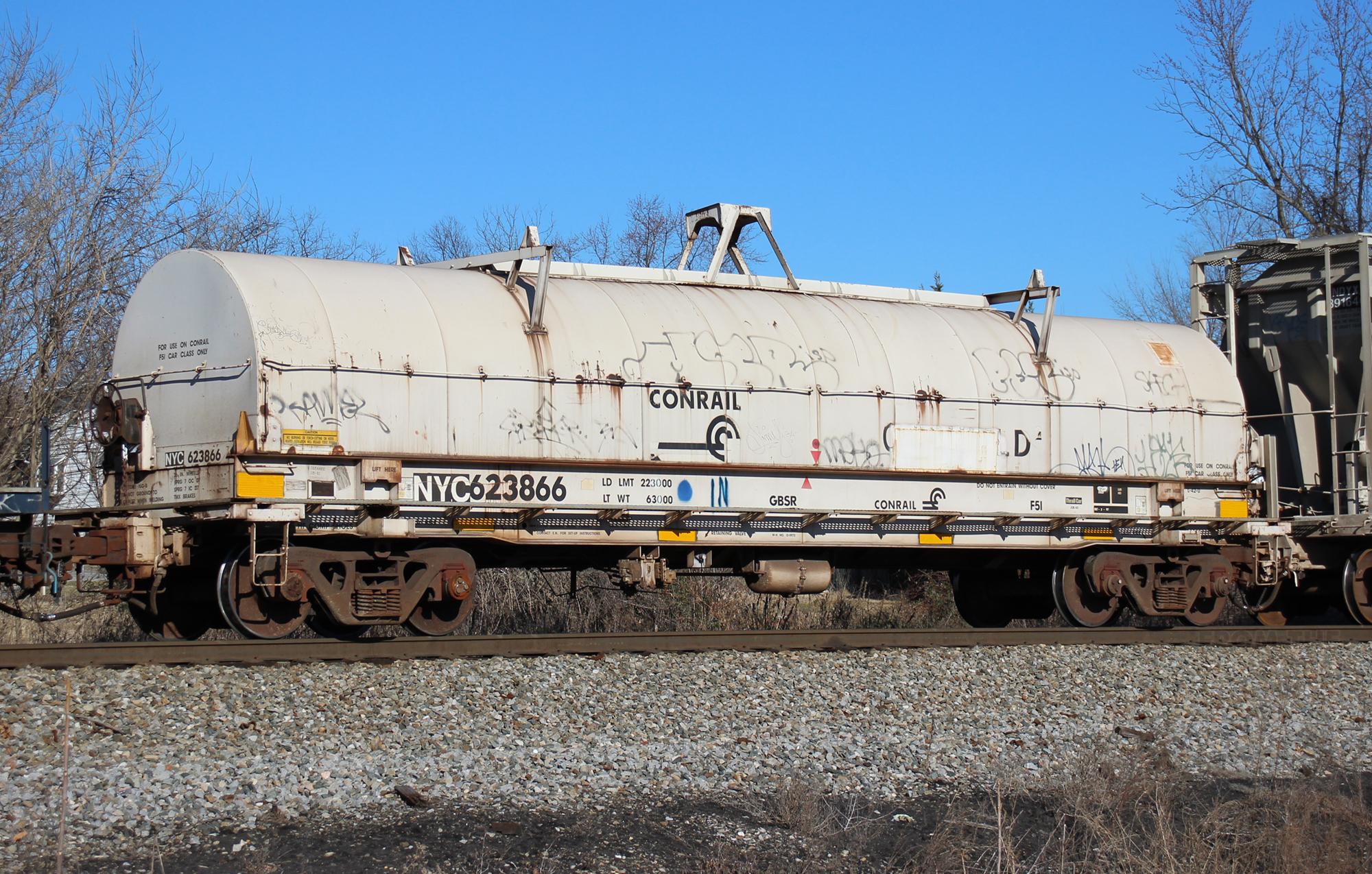 NYC 623866 is seen in the consist of CSX Q410-04at Wilmington, DE on 2/6/22. Car is ex CR 623866 and was built 7-97 by Thrall as part of Job 413.