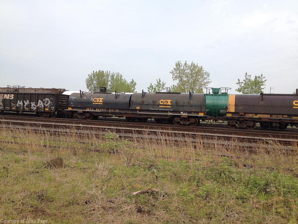 CSX NYC 627511 class F50 coil car (ex CR 627511/NYC 752511 built at Despatch shops in 1969) at Morrisville yard on May 10, 2014. The coil car rests between a G72F NS gondola and a CSXT 495684 coil car.