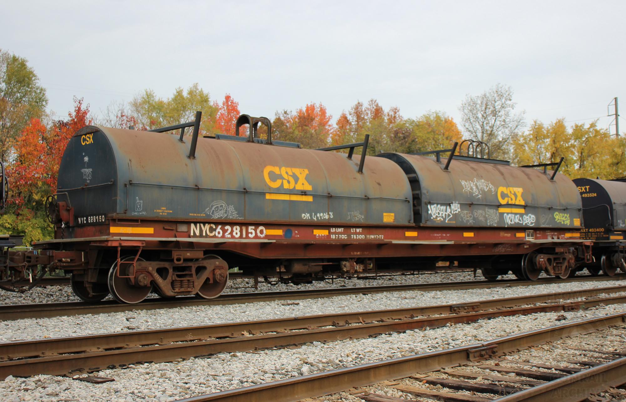 NYC 628150 is seen in the consist of CSX Q372-13 at Elsmere, DE on 11/14/21. Car is ex CR 628150and was built 10-77 by Thral
