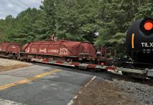 Former Conrail G52S class coil car NYC 631025 crosses Gordon St in Fairburn, GA on August 24, 2018