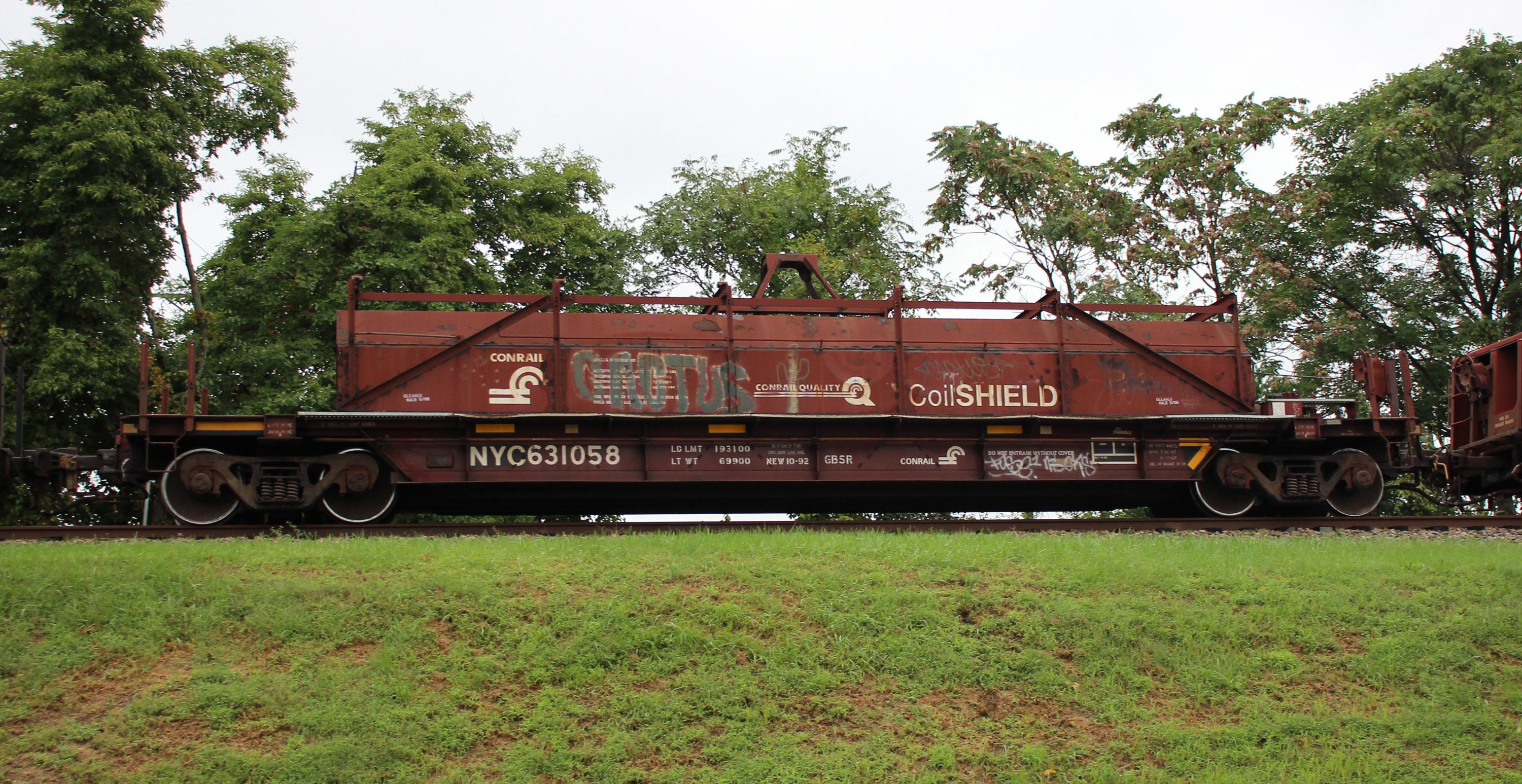 NYC 631058 is seen in the consist of CSX Q439-14 at Newark, DE on 10/15/18. Car is ex CR 631058 and was built 10-92 by Thrall.