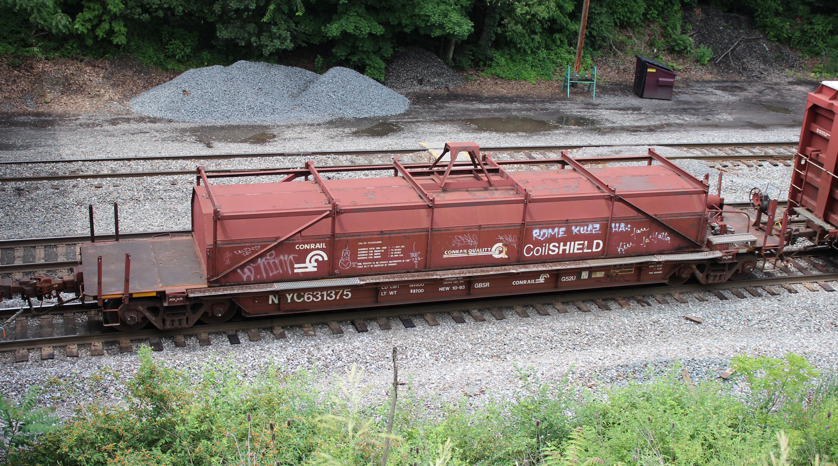 NYC 631375 is seen in the consist of CSX Q416-12 at Cumberland, MD on 6/13/18. Car is ex CR 631375 and was built 10-93 by HCS.