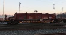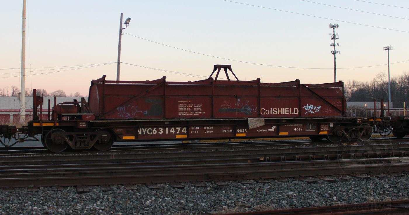 NYC 631474 is seen in the consist of CSX Q301-17 at Elsmere, DE on 2/18/17. Car is ex CR 631474 and was built 9-95 by HCS.