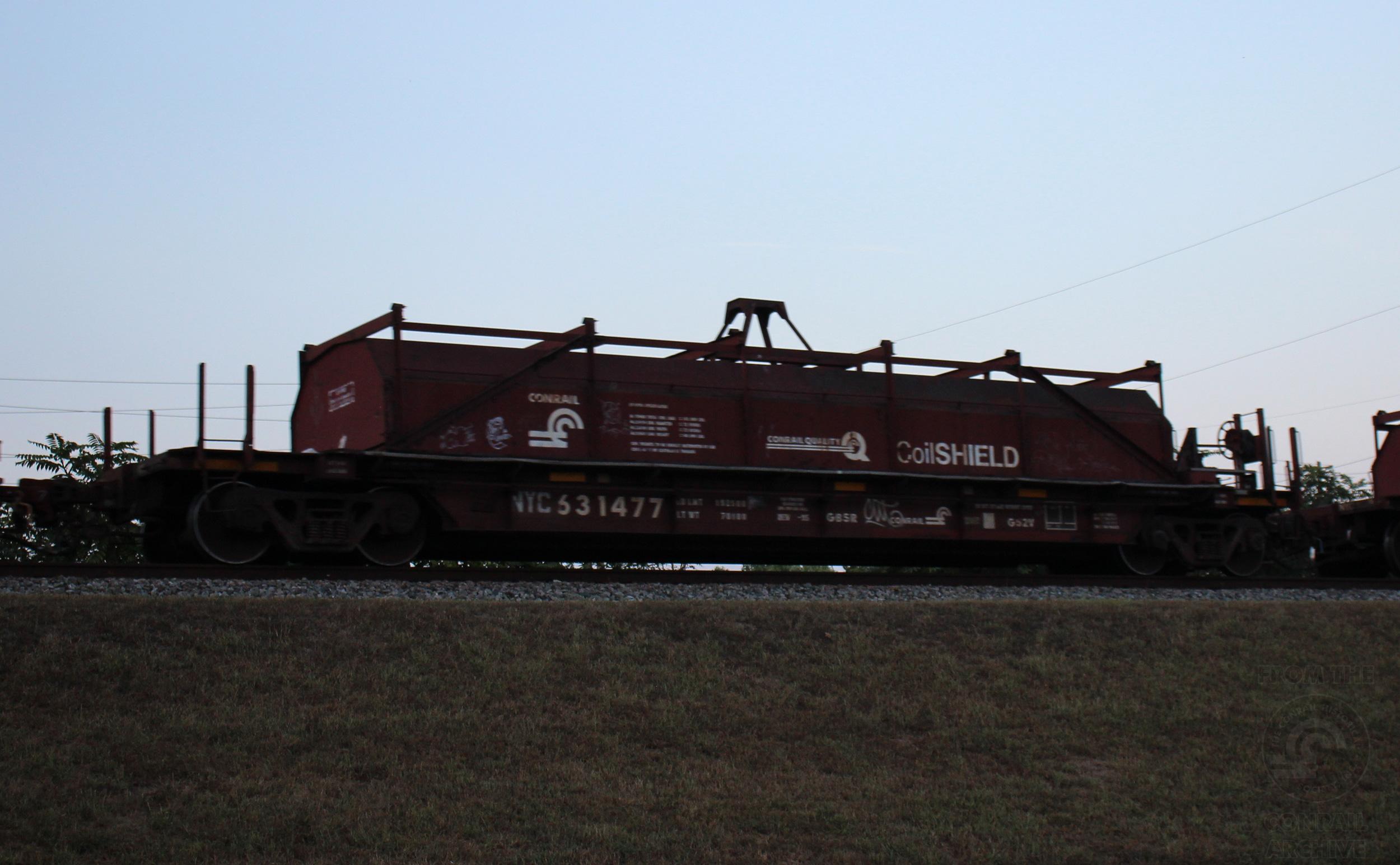 NYC 631477 is seen in the consist of CSX Q438-27 at Newark, DE on 9/28/19. Car is ex CR 631477 and was built 10-95 by HCS.