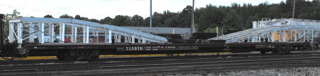 NYC 725570 is seen on CSX train DO21 at Elsmere DE on 9/10/08. Car is used to unload tie handers from gondolas.