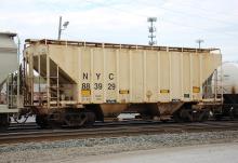 NYC 883929 is seen in the consist of CSX Q409-11 at Elsmere, DE on 4/12/20. Car is ex CR 883929, built 9-77 and was painted CSX ALRC 6-01. Car was making one of its last trips as it was billed to Gerdau Ameristeel US Inc in Petersburg, VA for scrapping. It was deleted 5/6/20. Photo by Chris Carangi.