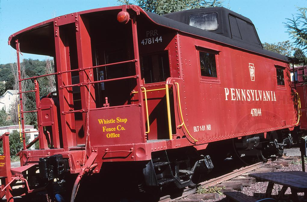 PRR 478144 is seen restored at Catawissa PA on 9/27/97. Caboose is ex CR 23378/PC 23778/PRR 478144 and was built 1-51.