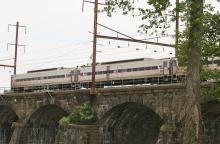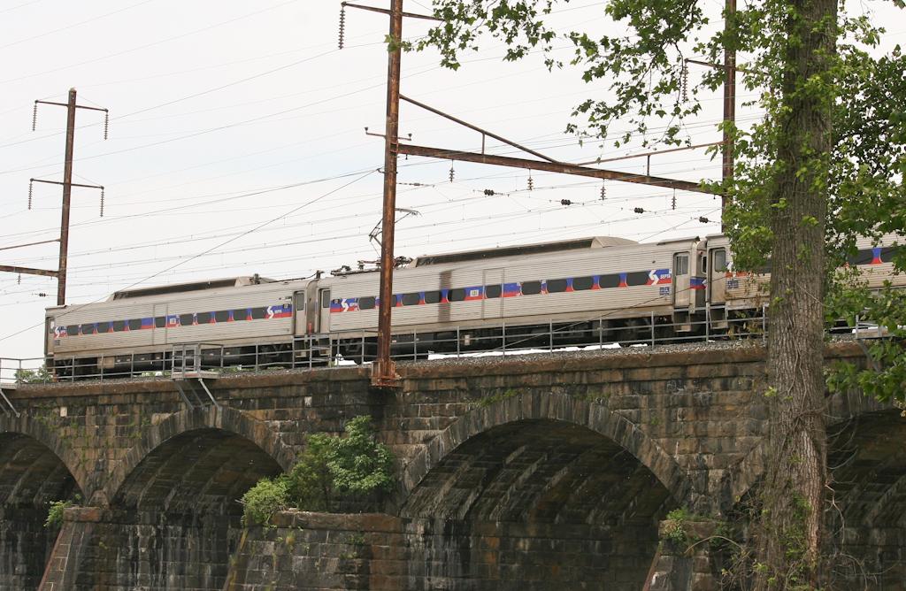 Silverliner IVs 132, 131, 448, and 447 head northbound across the Delaware River bridge at Morrisville, PA on June 1, 2021.