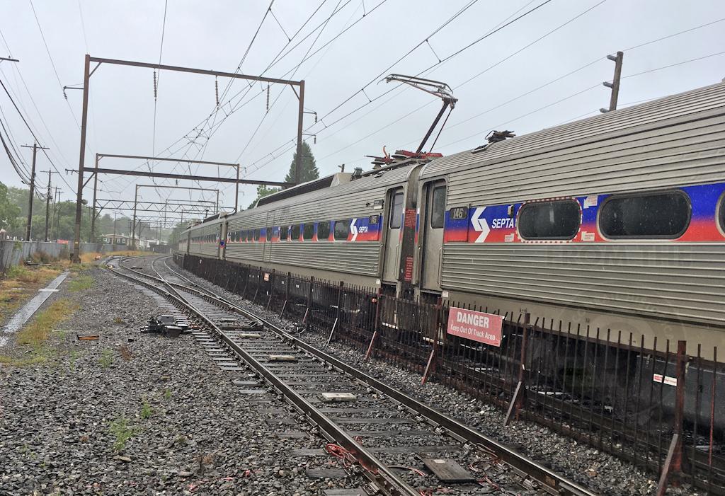 Surviving Commuter passenger service Silverliner IV 145 runs third in a quartet of MU's at Glenside Station on May 30, 2021.