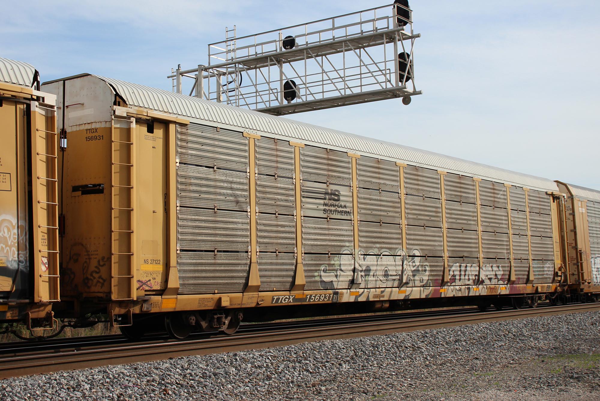 TTGX 156391is seen in the consist of CSX M217-22 at Savage, MD on 4/22/23. Rack was built as an unknown CR ML2L class rack in 1-92. It was then rebuilt, repainted, and renumbered to NS 27122 in 5-05 by MEI ESTL. Rack is now classed FB550 but is also stenciled ML2L.