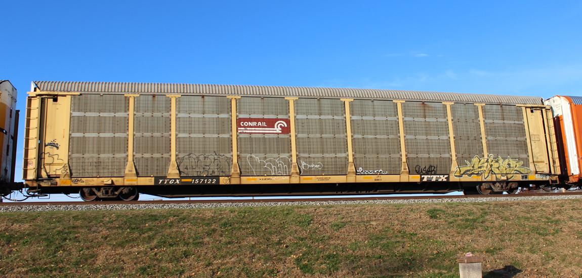 TTGX 157122 is seen in the consist of CSX Q296-20 at Newark, DE on 11/23/16. Rack number is CR 8115, built 4-90, rebuilt 3-98 and is now owned by CSX.